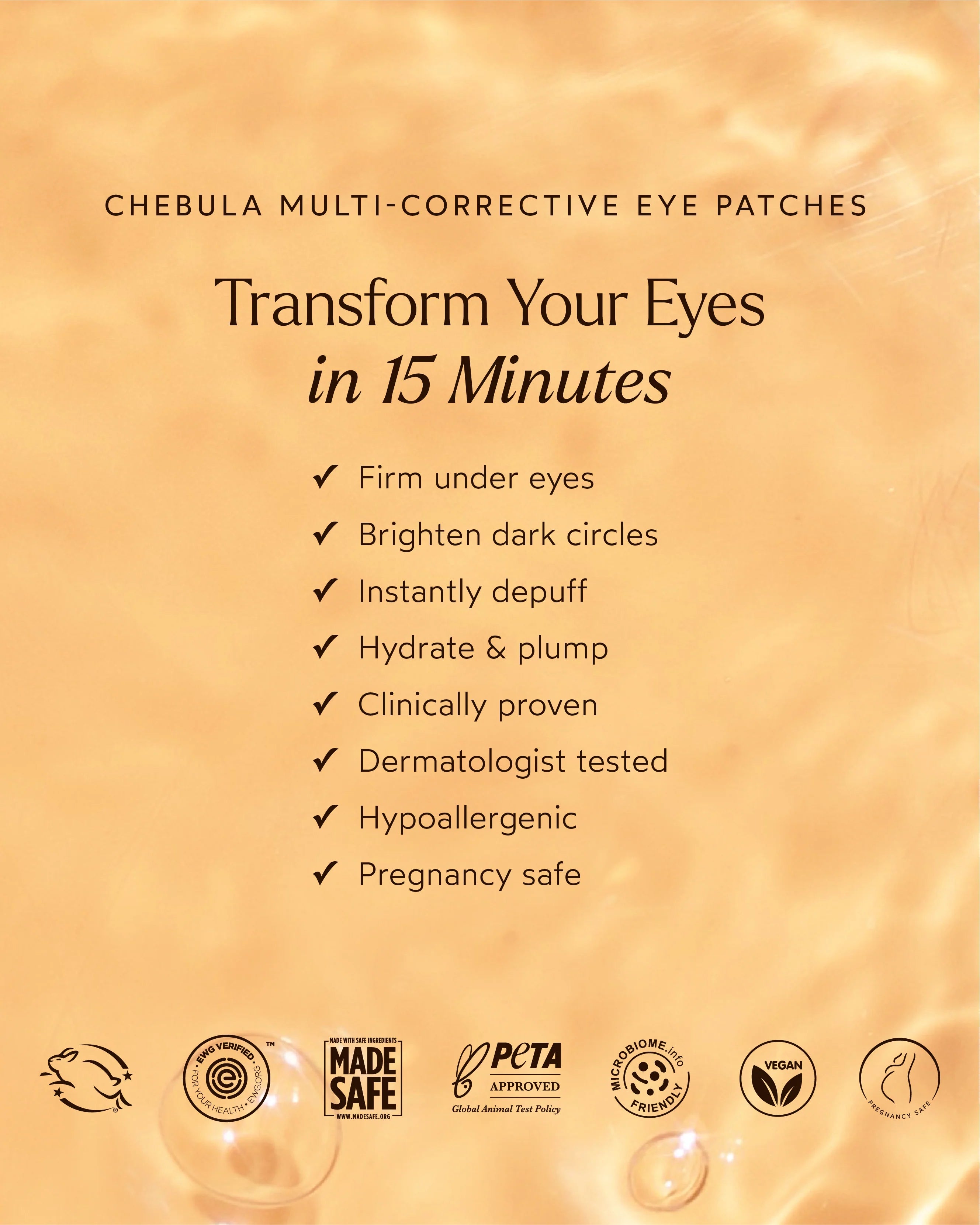 We’ve all used under eye patches for a “quick fix” but the results are often fleeting. Enter: Chebula Multi-Corrective Eye Patches – a luxurious and efficacious under eye treatment clinically proven to fight five signs of aging around the delicate eye area, in just 15 minutes. Our under eye patches are powered by Chebula: a cascading antioxidant clinically proven to optimize skin’s natural collagen levels. These eye patches transform the under eye area with 5 exceptional benefits: firm, brighten, de-puff, hydrate & plump! The innovative hydrogel patch technology allows for instant and long-lasting multi-corrective results. And in true, True Botanicals fashion, Chebula Multi-Corrective Eye Patches are MADE SAFE certified and 100% biodegradable as they instantly dissolve under warm water. These clinically proven under eye patches are easy to use, incredibly luxurious and effective making them an essential addition to your skincare ritual. This is the gold standard of under eye patches.
