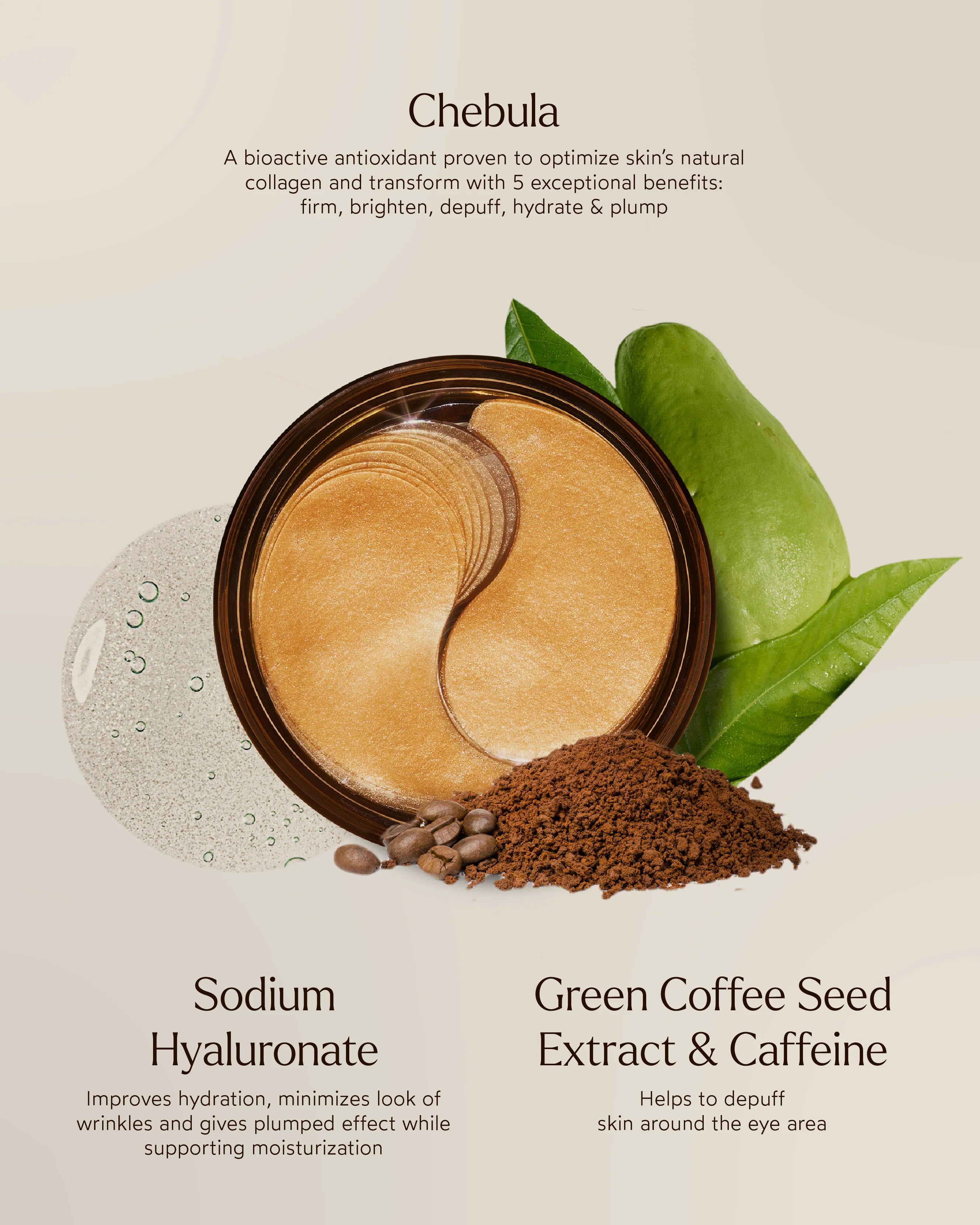 Transform your undereyes in just 15 minutes for long lasting results with our exceptional eye patches. Fueled by the power of Chebula - a bioactive and potent antioxidant proven to optimize skin’s natural collagen levels.